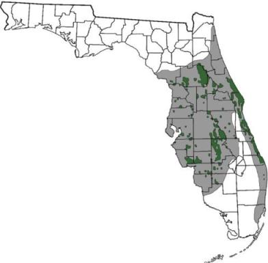 | The current range of the Florida scrub-jay is shown in green (black if viewing in black and white), and the historic range in gray. Map by Monica E. McGarrity in [79], The Florida scrub-jay: A species in peril. |