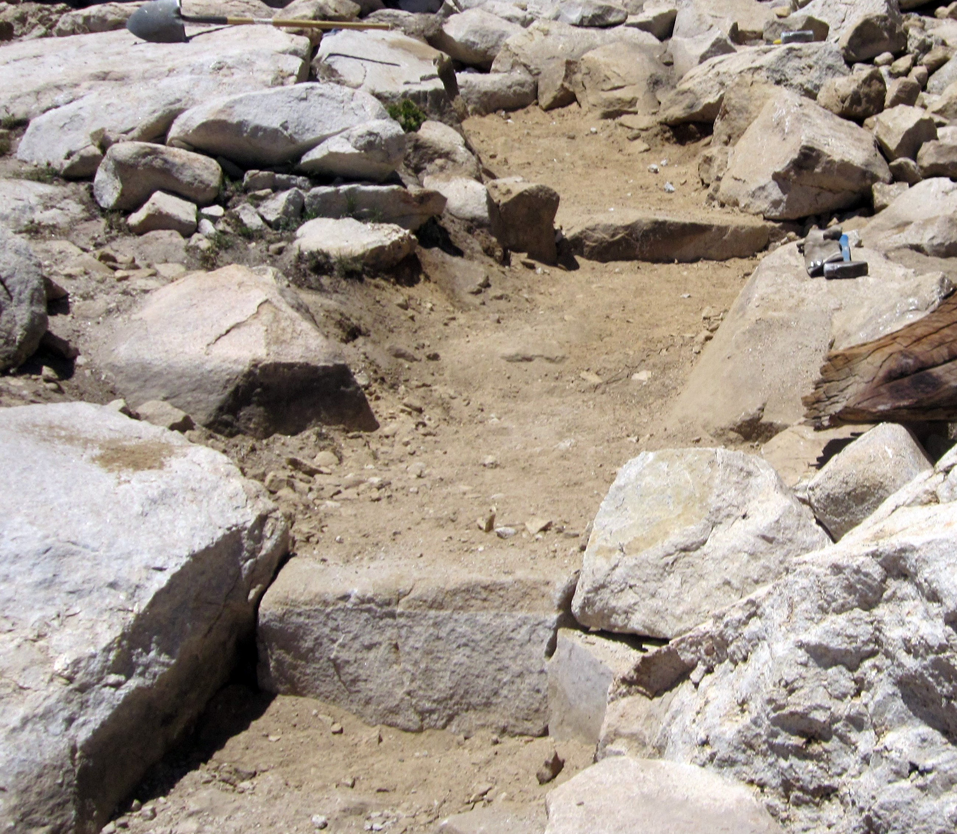 A technique to armor or "harden" the tread used when available rocks are not heavy enough to withstand use forces if laid flat. Instead, each rock is “pitched” or stood on the long axis and buried deeply to provide greater anchoring and strength.