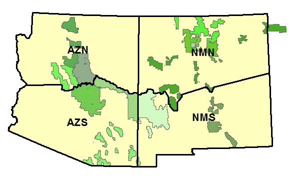Posted 11/3/2022 | Ecological Response Units - The purpose of this feature class is to be an ecosystem mapping tool across all of Arizona and New Mexico. Ecological Response Units (ERUs) facilitate landscape analyses and planning. The framework represents all major ecosystem types of the southwest region, and represents a stratification of biophysical themes. ERUs are used to define historic/reference conditions within a mapping unit by integrating site potential (soil physical and chemical properties, geology, geomorphology, aspect, slope, climate variables, and geographic location), fire regime (historic and contemporary), neighboring vegetation communities, and seral state sequence. The shapefile data is tiled into four tiles: Arizona North, Arizona South, New Mexico North, New Mexico South. View a sample image of the tile locations |