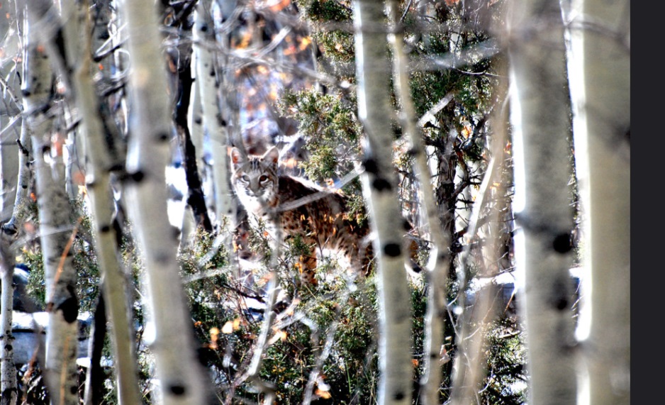 Bobcat camouflaged in the trees near Honslinger Creek on the Ashley National Forest