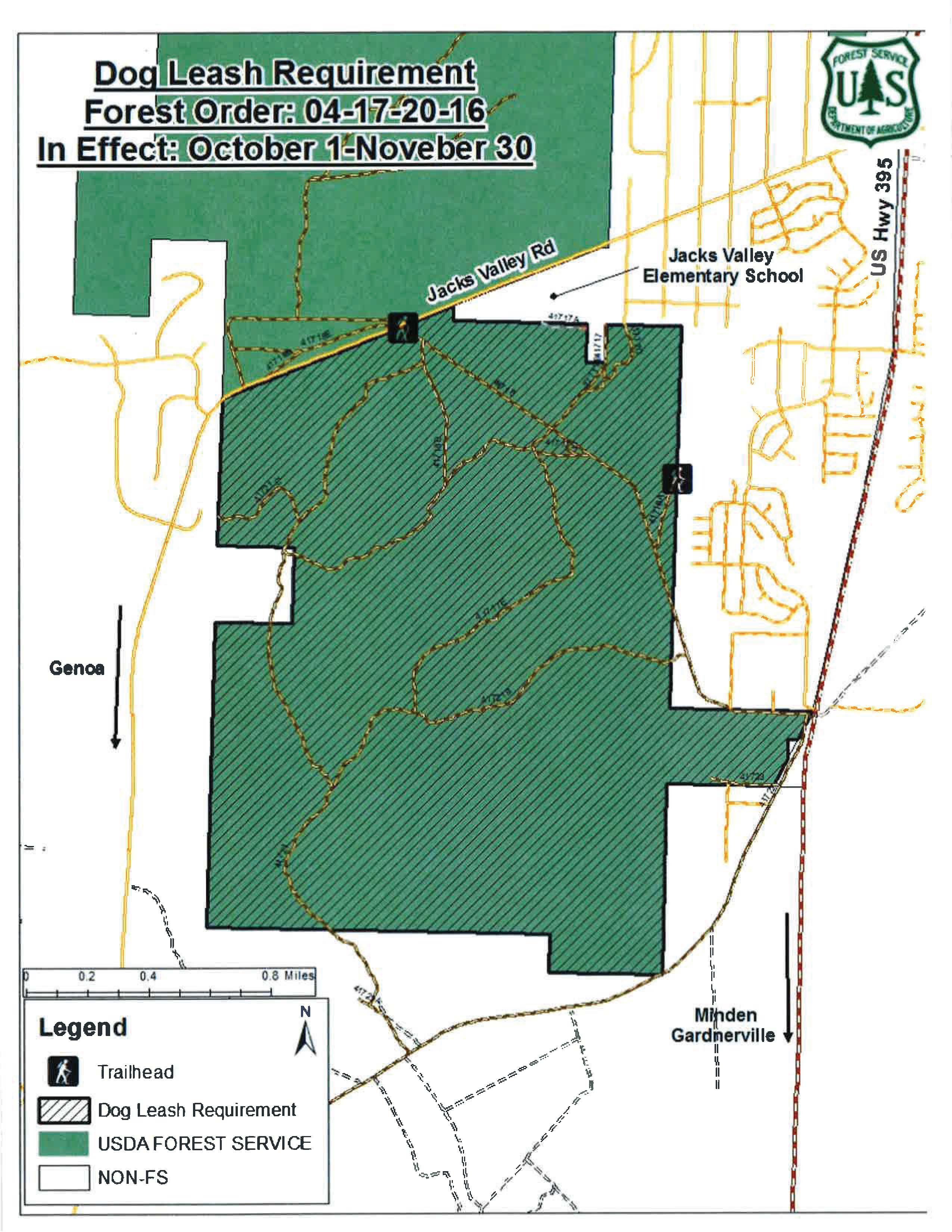 Dogs mush be leashed within the boundaries of the Forest Service System Lands in the Jacks Valley Wildlife Management area south and west of Jacks Valley Road, east of Highway 395 at Forest Boundary and to the south at the Forest Boundary within the Management area.