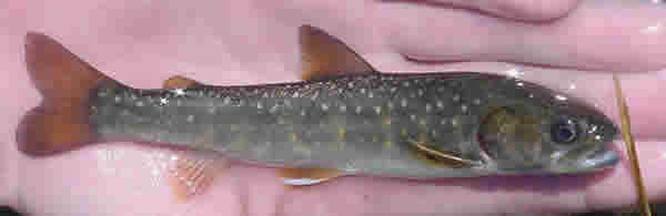 Look at the trout below. Note how the trout has 1) a dark body with light spots and 2) no black or gray markings in the dorsal fin. Therefore, it is a bull trout and must be released.
