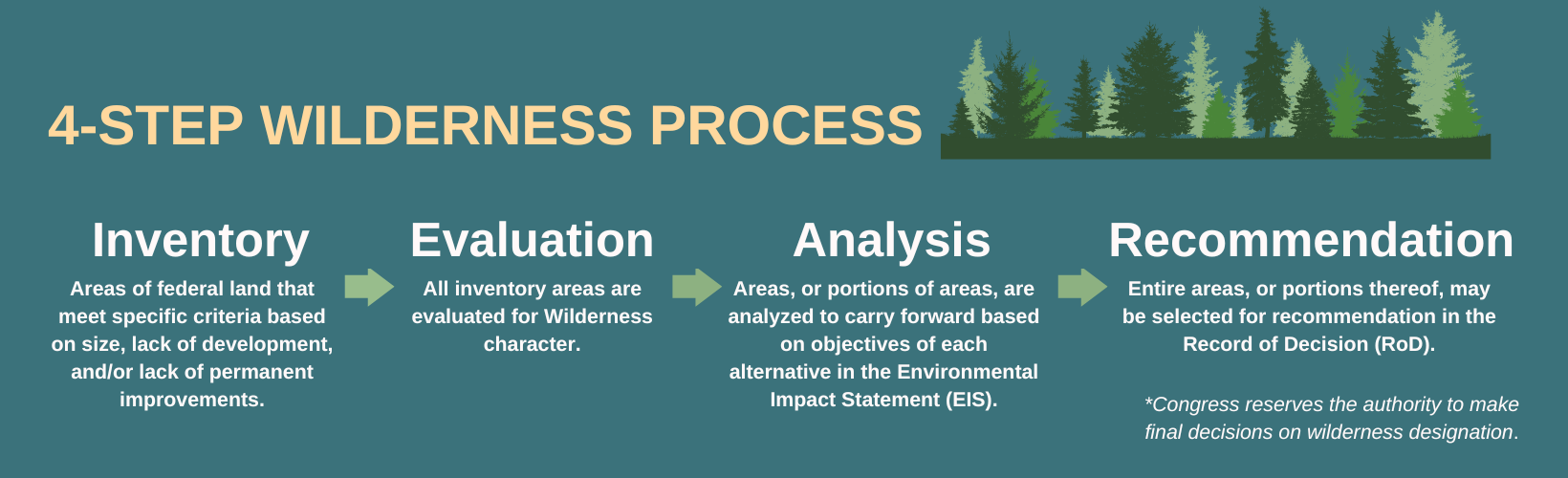 Step 3: Analysis – Design alternatives that include which areas, if any, to include in the plan as “recommended wilderness”. As part of the National Environmental Policy Act process, publish information about effects of each alternative.
