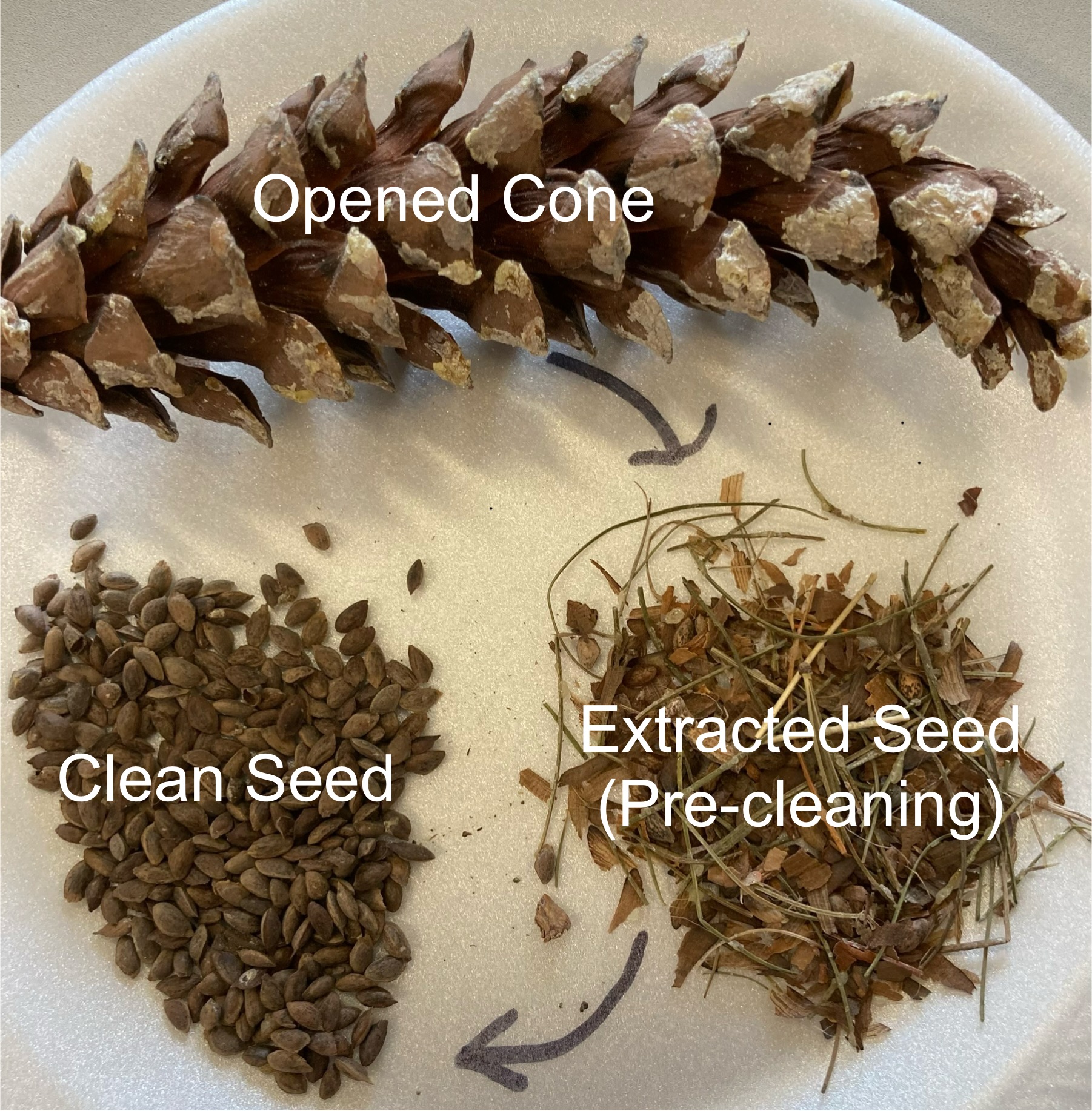 Many other types of seed from native trees, shrubs, grasses, forbs, and herbaceous plants are extracted and cleaned at the nursery. All these types of seed require different techniques to clean them. They may need to be removed from pods, cones, or fruit, or they may need to be separated from wings or fibers. If the seed is cleaned properly, it will remain viable for many years in storage. Some of the conifer species may be stored in the seed cache beyond 20 years.