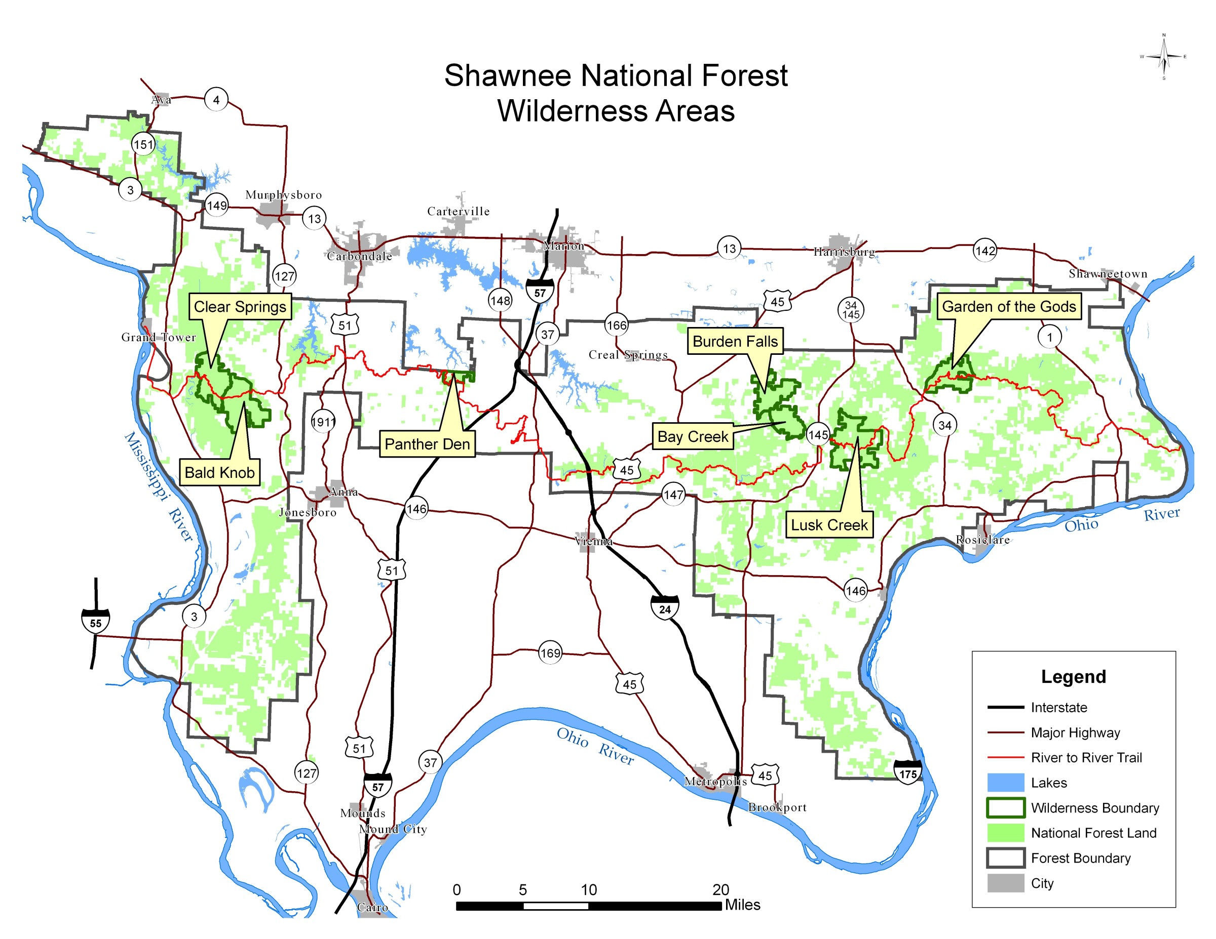 Obtaining detailed trail maps is highly recommended before entering wilderness as well as proper planning and precautions before and during your visit. Detailed trail maps are available at all Shawnee offices or by mail through the Friends of the Shawnee.