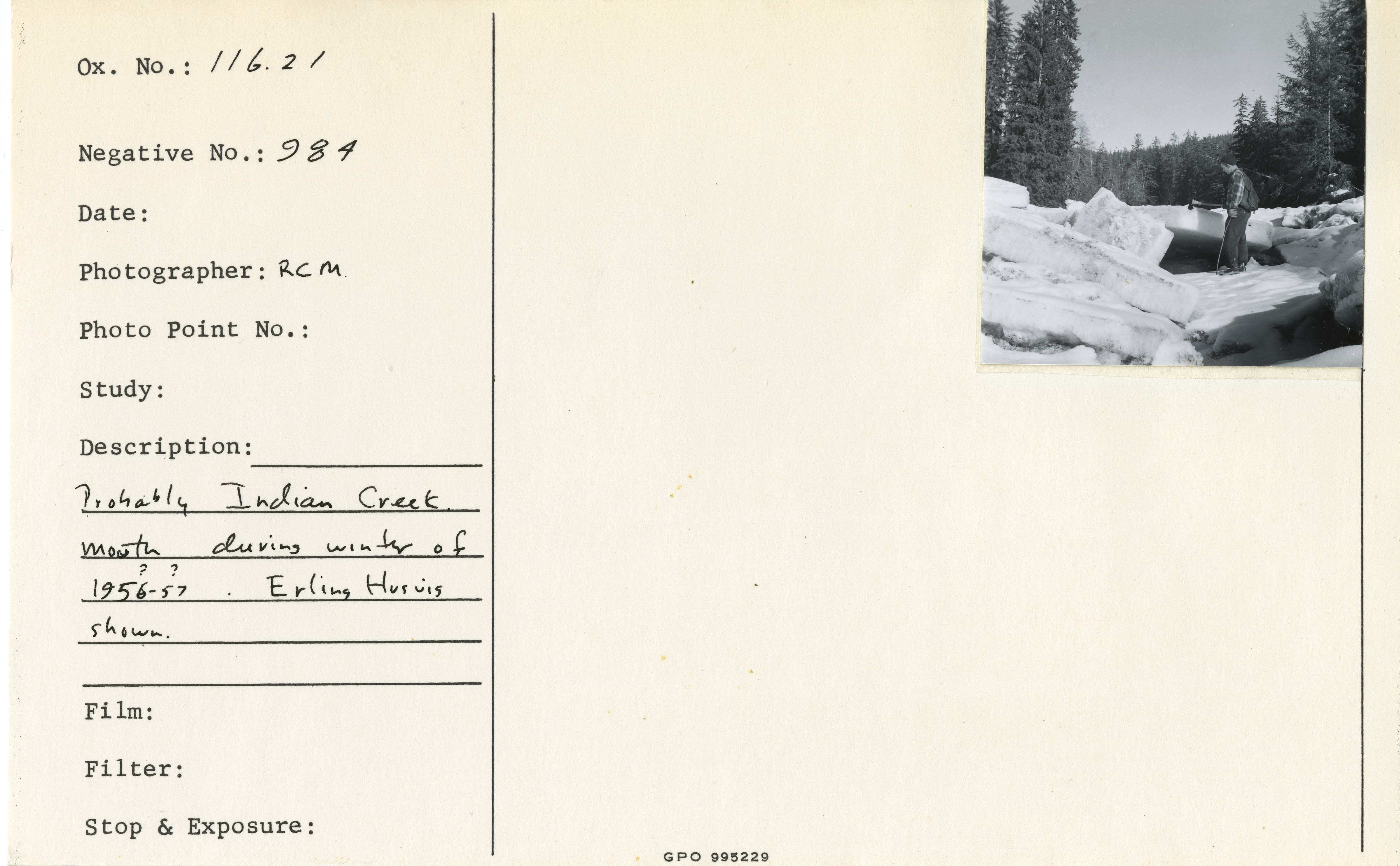 | Description: | Probably Indian Creek mouth during winter of 1956-57?? Erling Husvik shown. |