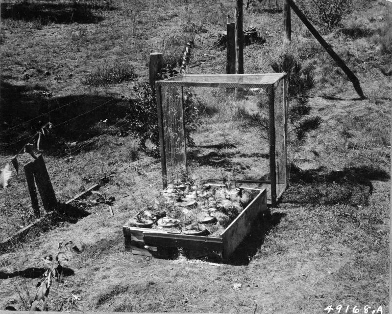 | Description: | Transpiration. Showing transpiration pots in place. Excelsior is packed around pots. Screen used to protect against animals. Gage raised. |