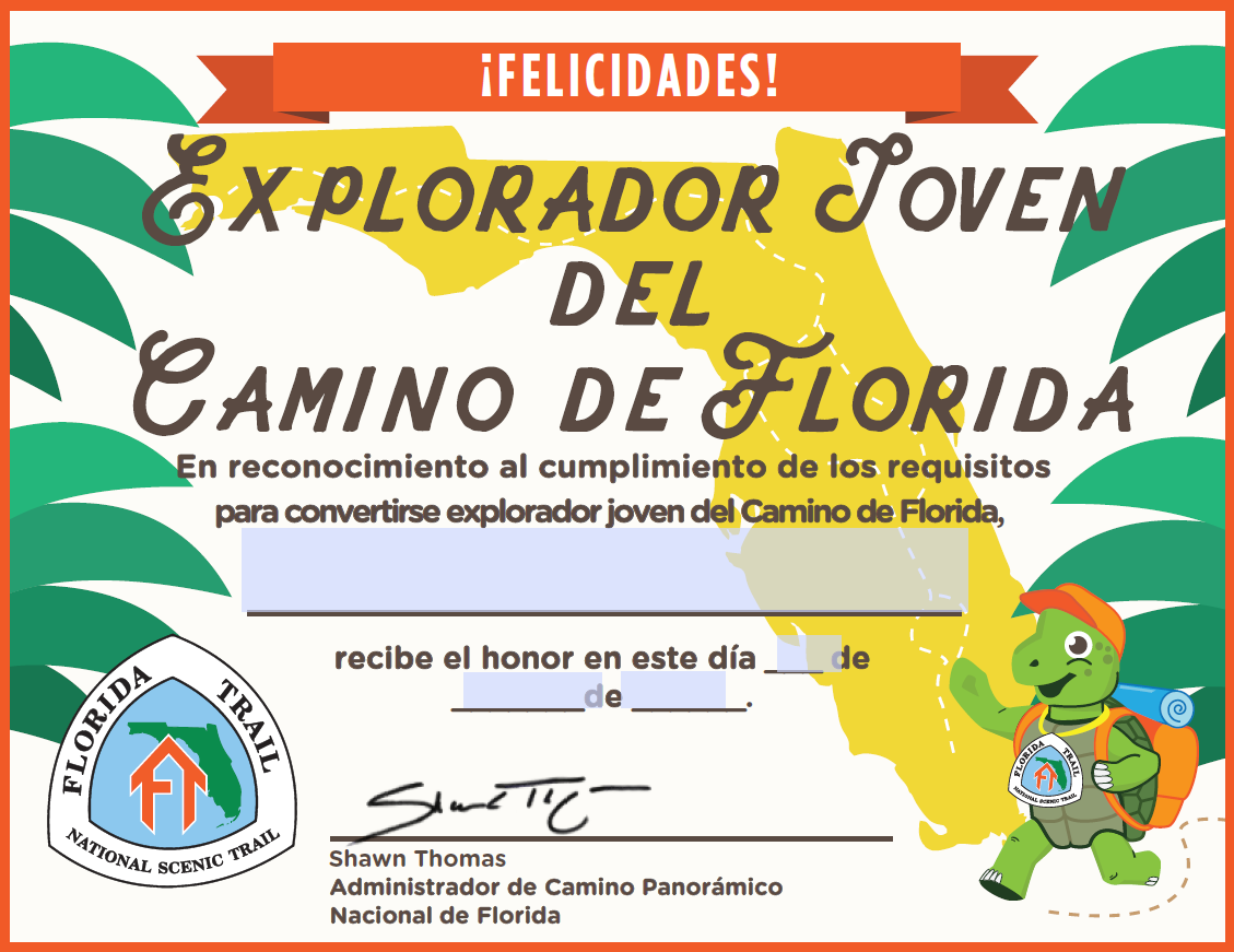 ¡Cuando haya terminado, llene e imprima el Certificado de finalización para convertirse oficialmente un Joven Explorador del Camino de Florida!