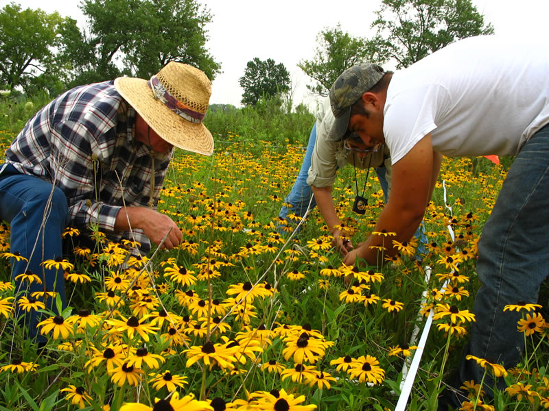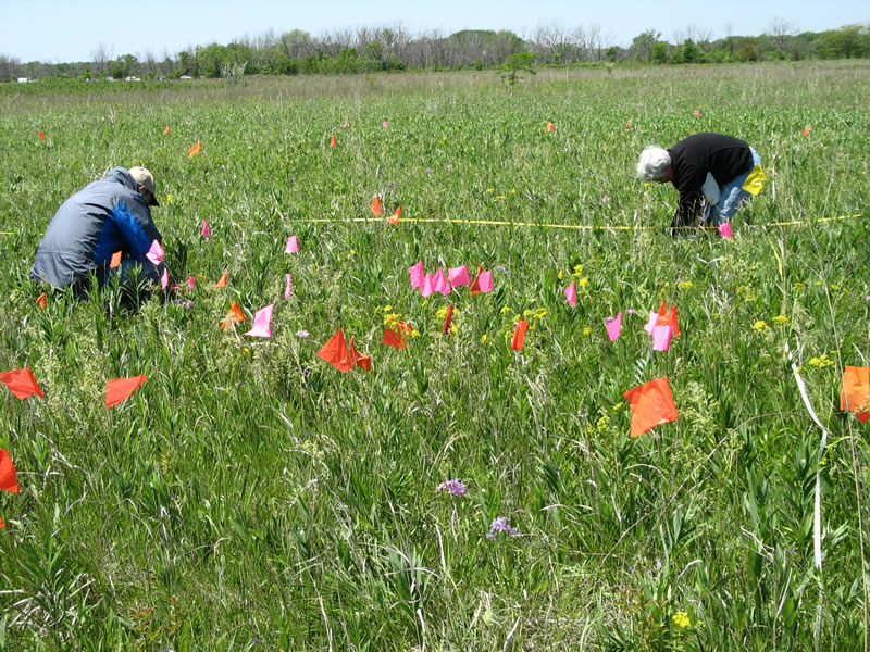 Volunteers Don Nelson and Gail Pyndus with Midewin seasonal worker, Steve Bissett, in the Perdue orange coneflower burn plot, counting stems and collecting data. Photo by Emily Kapler.